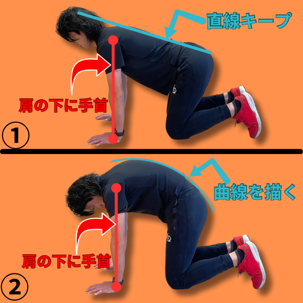 ①肩の下に手首、股関節の下に膝をつき、四つ這いの姿勢を作ります。